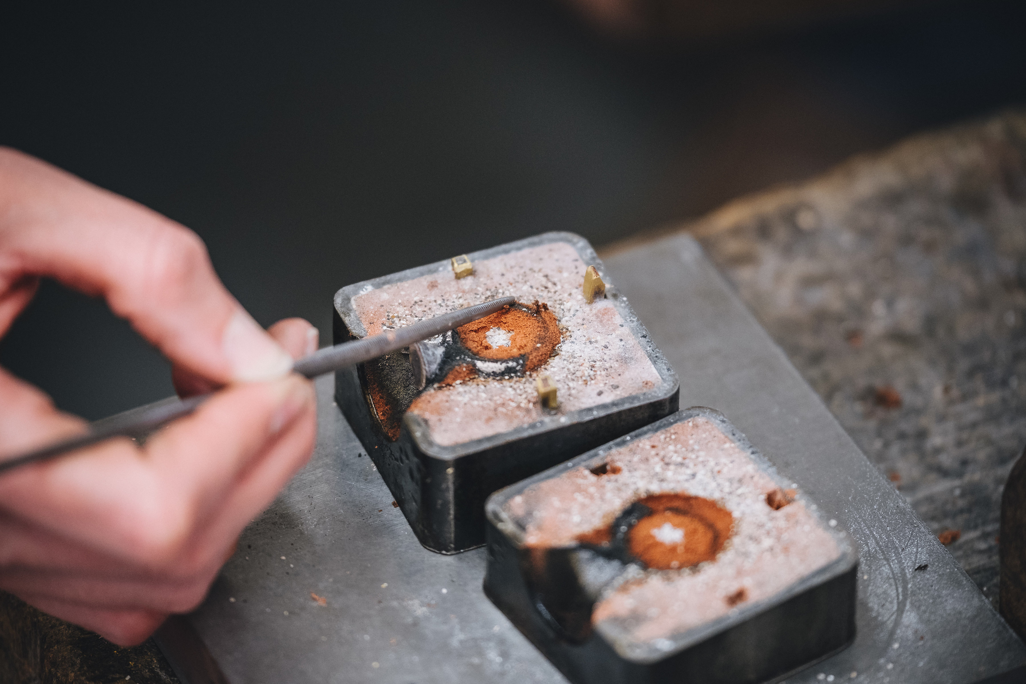 Flourishing as a Jeweller, Justin progressively developed his distinctive approach, hallmark and ethics. Sand-filled moulds give asperity and texture to the metal, just like wind and water sculpt the Cornish shores. Wood from sunken boats, defunct furniture or from your own orchard finds a second life in his workshop, inlaid in silver, gold, platinum or palladium. Ethically-sourced and recycled metals are cast into unique pieces of jewellery.